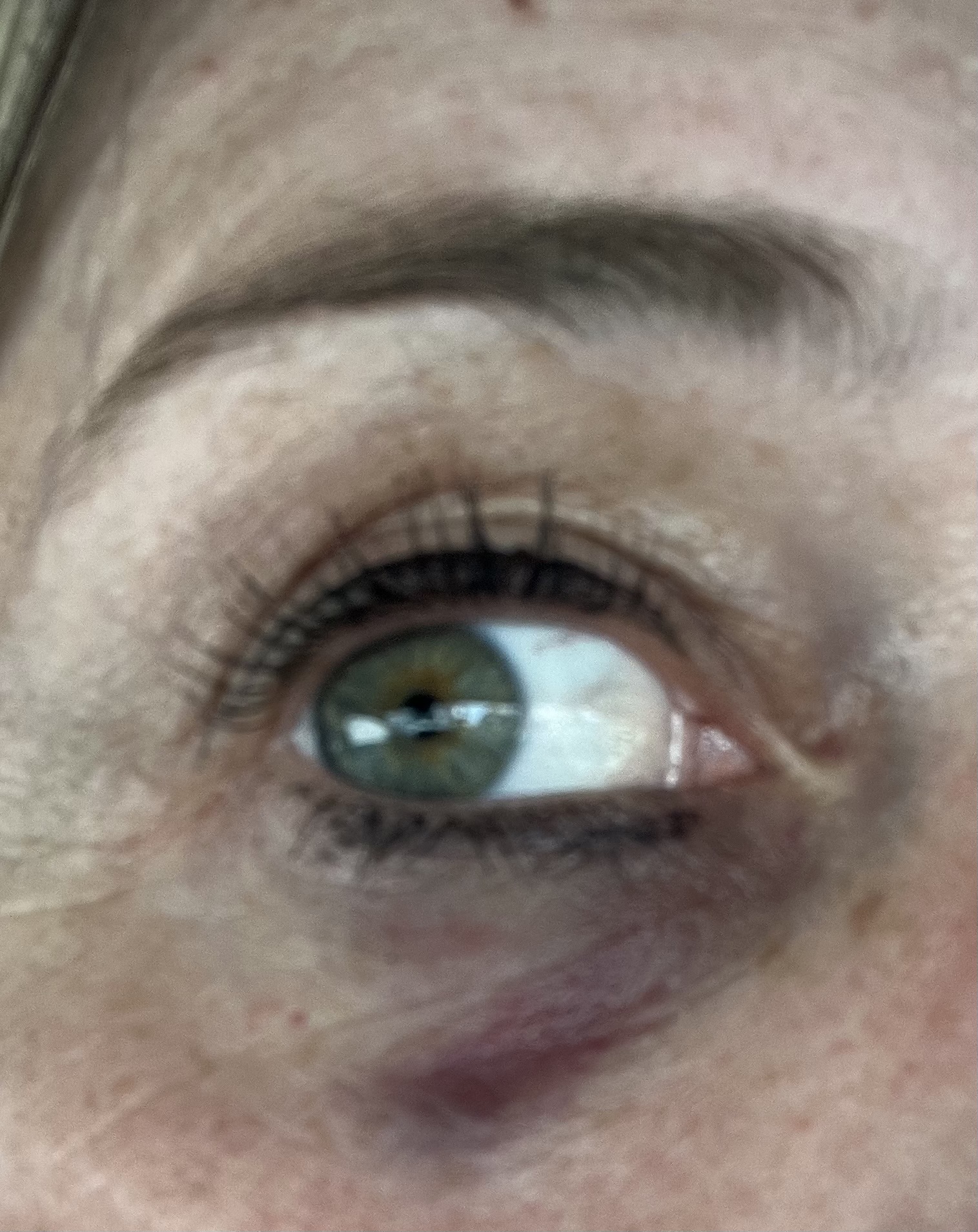 A 42-year-old woman experiences an attack conflict in the eye area after receiving a threatening email from her boss. During the CA phase (5 days), unnoticed cell proliferation occurs in the sclera and as a protective reaction. After conflict resolution (boss reassures her), the PCL phase begins: inflammatory breakdown of cells, minor vessel ruptures → bruise under the eye (black eye), swelling, and color changes until full recovery. Biological purpose: temporary protection of the eyes during the “danger period.”